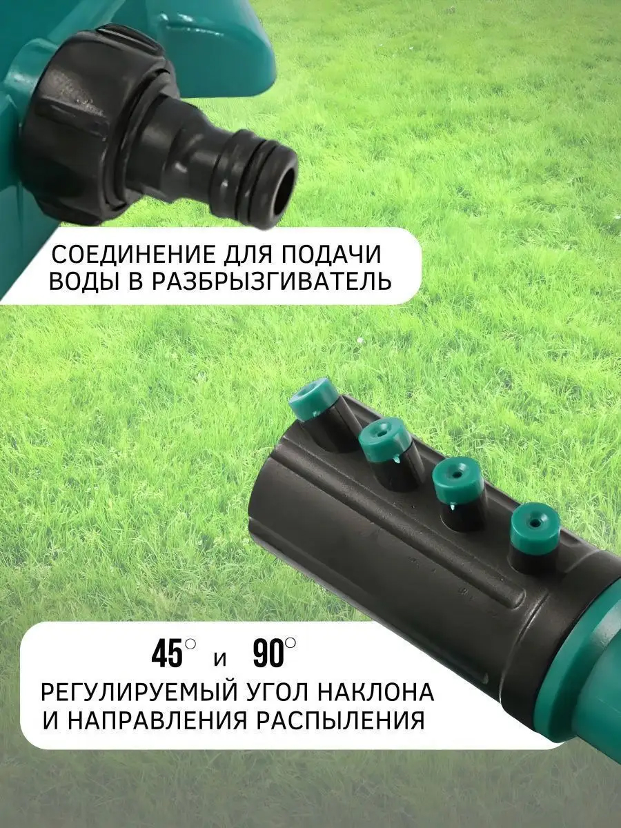 Спринклер вращается на 360 градусов, обеспечивая эффективное разбрызгивание воды. Диаметр распыления составляет от 7 до 12 метров, что делает его идеальным для обработки плодовых кустарников, фруктовых деревьев и рассады в парнике. Этот прочный механизм с наконечником-рассеивателем значительно упрощает уход за вашим садом и экономит ваши силы.
